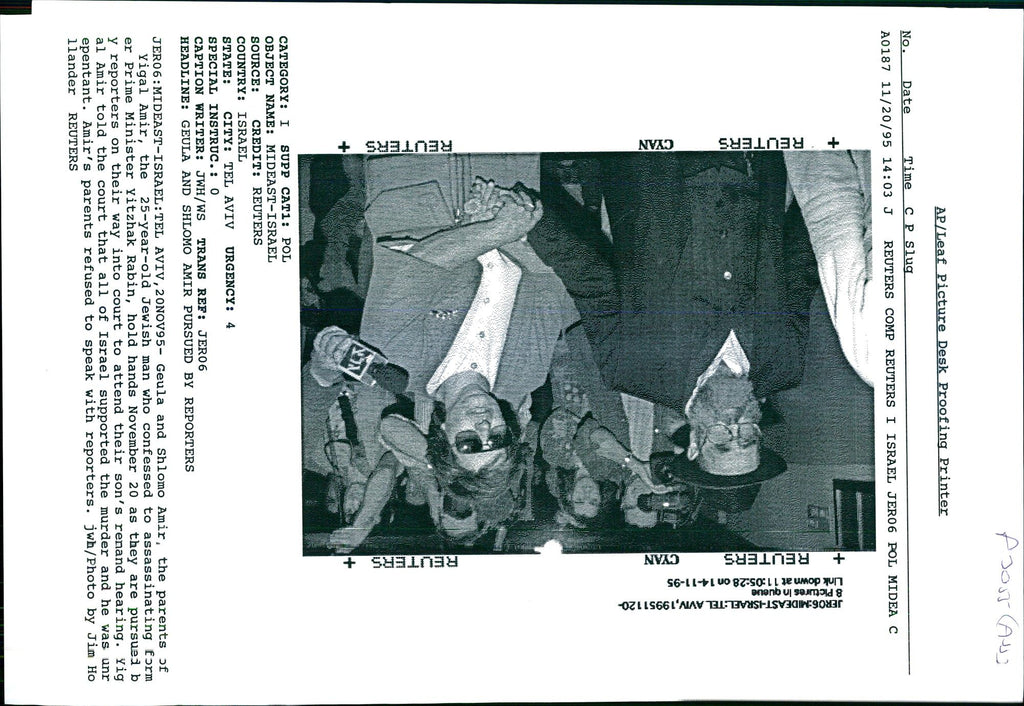 Yigal Amir, 25, confessed to assassinating Israeli Prime Minister Yitzhak Rabin. Amir told the court that all of Israel supported the murder and he was unr epentant. Amir's parents refused to speak with reporters. Yigal's parents Geula and Shlomo Amir hold hands as they are pursued by reporters. Yigal Amir, 25, confessed to assassinating Israeli Prime Minister Yitzhak Rabin. Amir told the court that all of Israel supported the murder and he was unr epentant. Amir's parents refused to speak with reporters. Yigal's parents Geula and Shlomo Amir hold hands as they are pursued by reporters.