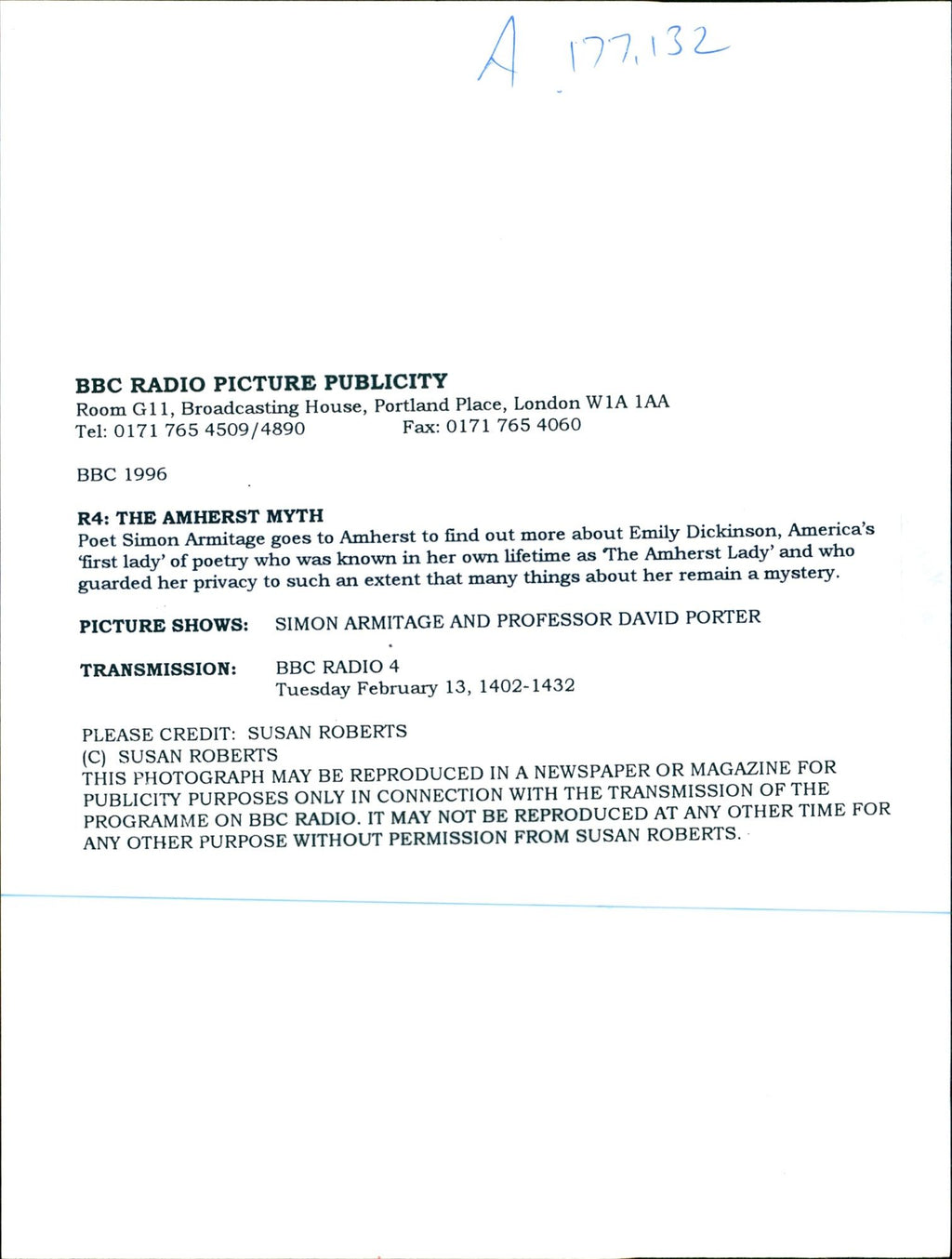 Poet Simon Armitage goes to Amherst to find out more about Emily Dickinson. America's first lady ' of poetry guarded her privacy to such an extent that many things about her remain a mystery. BBC 1996 R4 : THE AMHERST MYTH Tuesday February 13 , 1402-1432. Poet Simon Armitage goes to Amherst to find out more about Emily Dickinson. America's first lady ' of poetry guarded her privacy to such an extent that many things about her remain a mystery. BBC 1996 R4 : THE AMHERST MYTH Tuesday February 13 , 1402-1432.