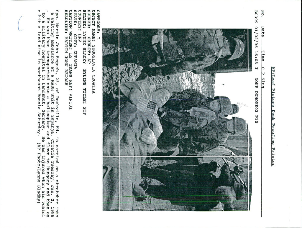 Spc. Martin John Begosh was injured when his vehicl e hit a land mine in northeast Bosnia Saturday. He was then transported onto a helicopter and flown to Hungary and then on to a military hospital in Landshut , Germany. The 23-year-old from Rockville, Md. is being treated at a MASH unit in Croatia. Spc. Martin John Begosh was injured when his vehicl e hit a land mine in northeast Bosnia Saturday. He was then transported onto a helicopter and flown to Hungary and then on to a military hospital in Landshut , Germany. The 23-year-old from Rockville, Md. is being treated at a MASH unit in Croatia.