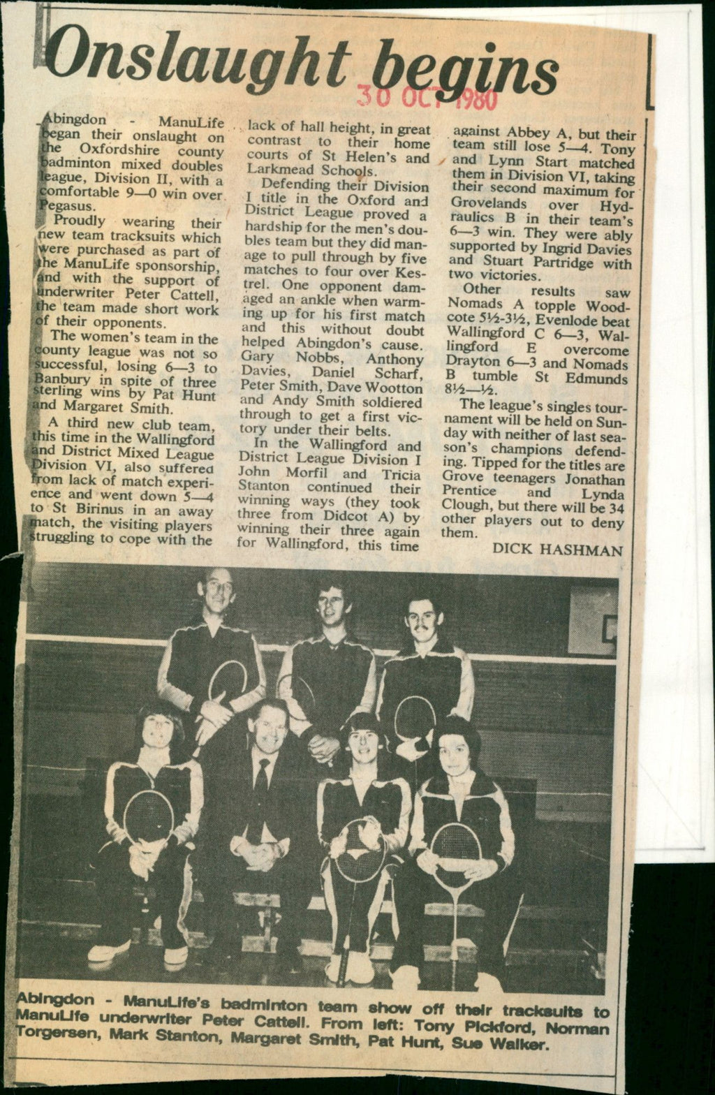 Abingdon ManuLife, a badminton team in the Oxfordshire county courts, began their Division II mixed doubles league with a 9-0 win over Pegasus. Proudly wearing their new team tracksuits that were purchased as part of the ManuLife sponsorship, the team received support from their underwriter Peter Cattell. In the Oxford and District League Division I, the men's doubles team managed to pull through by five matches to four over Kestrel. In the Wallingford and District League Division I, John Morfil and Tricia Stanton won their three matches for Wallingford. The women's team was not as successful, losing 6-3 to Banbury. A third club team in the Wallingford and District Mixed League Division VI, suffered a 5-4 loss to St Birinus. Abingdon ManuLife, a badminton team in the Oxfordshire county courts, began their Division II mixed doubles league with a 9-0 win over Pegasus. Proudly wearing their new team tracksuits that were purchased as part of the ManuLife sponsorship, the team received support from their underwriter Peter Cattell. In the Oxford and District League Division I, the men's doubles team managed to pull through by five matches to four over Kestrel. In the Wallingford and District League Division I, John Morfil and Tricia Stanton won their three matches for Wallingford. The women's team was not as successful, losing 6-3 to Banbury. A third club team in the Wallingford and District Mixed League Division VI, suffered a 5-4 loss to St Birinus.
