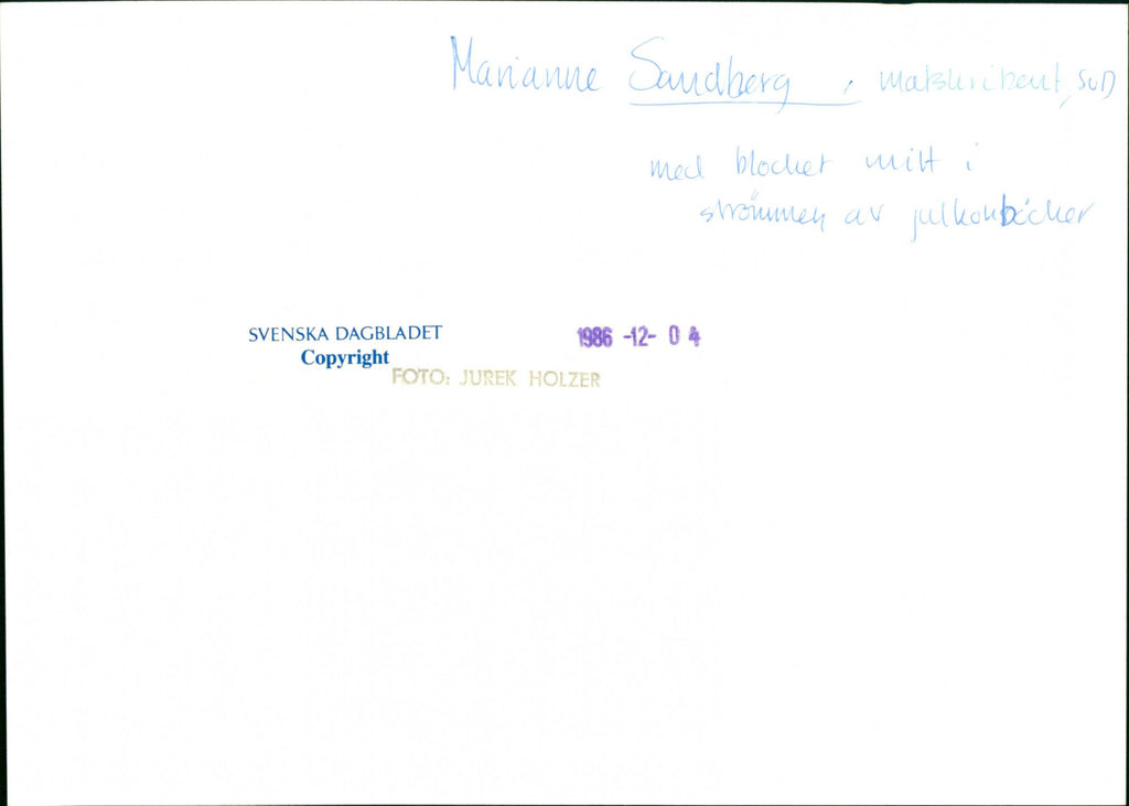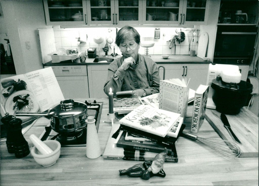 Food writer Marianne Sandberg with the notepad in the middle of the stream of Christmas cookbooks - Vintage Photograph