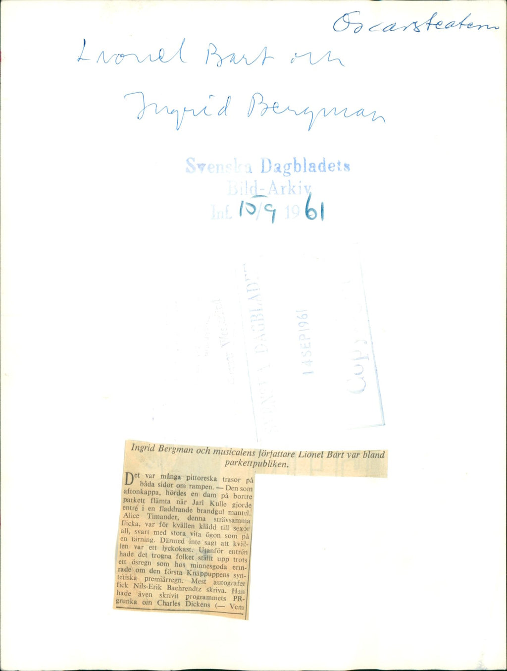 Ingrid Bergman and the musical's writer Lionel Bart were among the parquet audience at the Oscars Theater - Vintage Photograph