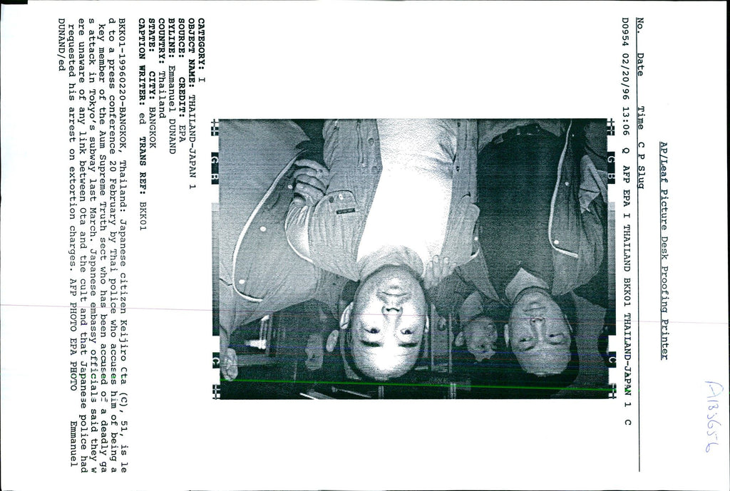 Japanese citizen Keijiro Cta ( c ) , 51 , is le d to a press conference 20 February by Thai police who accuse him of being a key member of the Aum Supreme Truth sect. Japanese embassy officials said they w ere unaware of any link between Ota and the cult. Japanese police had requested his arrest on extortion charges. Japanese citizen Keijiro Cta ( c ) , 51 , is le d to a press conference 20 February by Thai police who accuse him of being a key member of the Aum Supreme Truth sect. Japanese embassy officials said they w ere unaware of any link between Ota and the cult. Japanese police had requested his arrest on extortion charges.