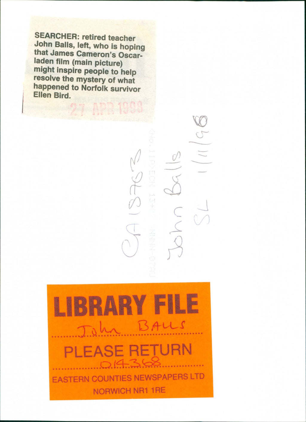 Retired Teacher John Balls, who is hoping that James Cameron's Oscar- the laden film might inspire people to help resolve the mystery of what happened to Norfolk survivor Ellen Bird.