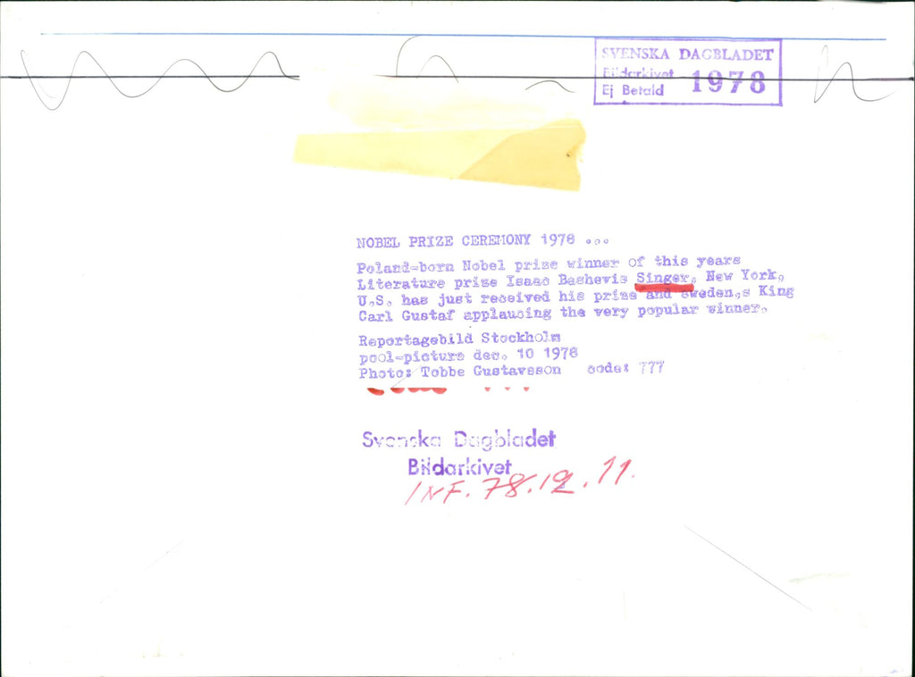 Nobel prize winner of this years Literature prize Isaac Bashevis Singer, New York, U, S has just received his prize at Sweden, King Carl Gustaf applauds the very popular winner