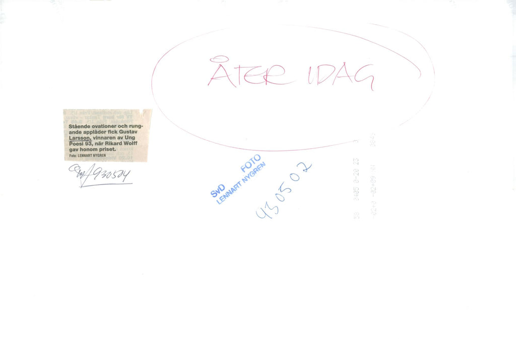 Swedish poet Gustav Larsson wins Young Poesi93, receives award by Rikard Wolff - Vintage Photograph
