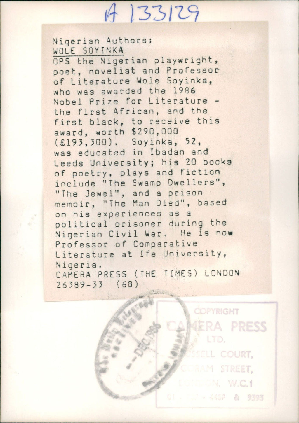 Akinwande Oluwole Babatunde Soyinka, is a Nigerian playwright, poet and essayist. He was awarded the 1986 Nobel Prize in Literature, the first African to be honoured in that category. Soyinka was born into a Yoruba family in Abeokuta. Akinwande Oluwole Babatunde Soyinka, is a Nigerian playwright, poet and essayist. He was awarded the 1986 Nobel Prize in Literature, the first African to be honoured in that category. Soyinka was born into a Yoruba family in Abeokuta.