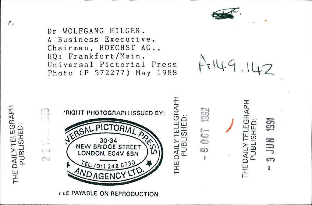 Dr. Wolfgang Hilger, A business executive Chairman, Hoechst AG. HQ: Frankfurt/Main. Dr. Wolfgang Hilger, A business executive Chairman, Hoechst AG. HQ: Frankfurt/Main.